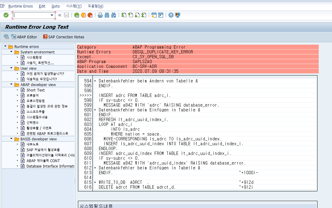 세부항목을 확인하면 ST22에서 내용을 확인하라고 나옴.