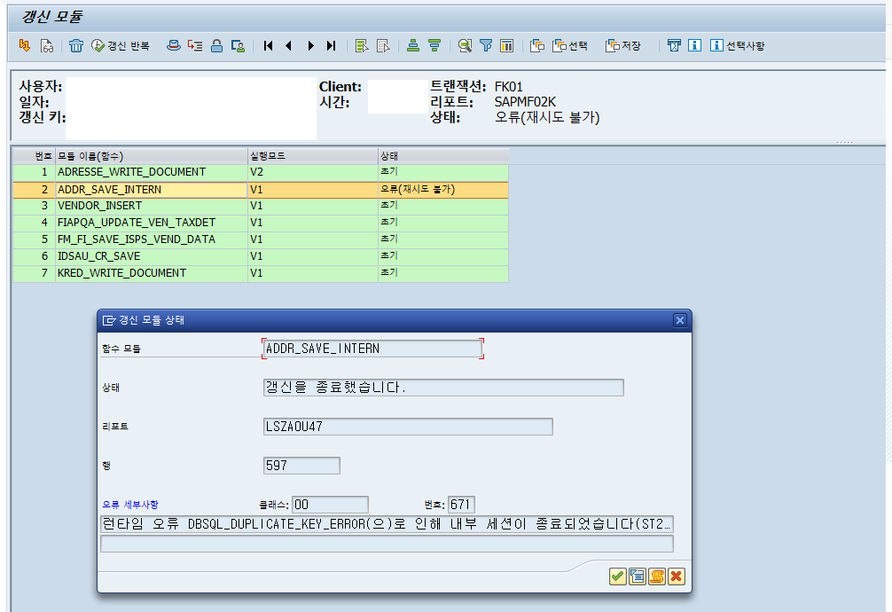 ST22를 확인하면 정확한 원인 확인 가능함. (대부분 Number Range 관련 문제로 발생함.)